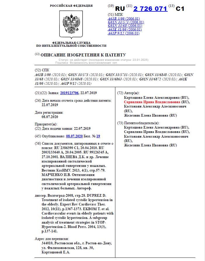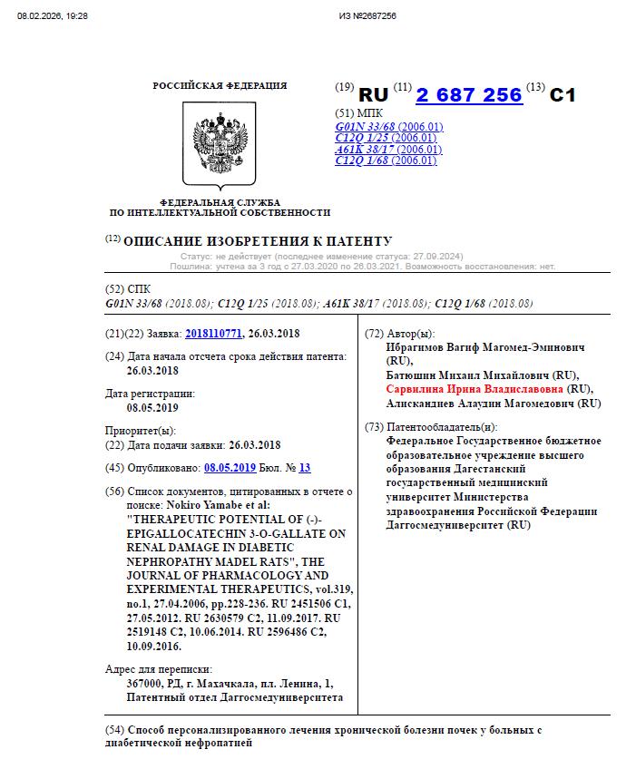 | Наши ПатентыРоссийские изобретатели завоевали высокие награды на Международной выставке изобретений «Idea-Expo 2019» в Сольноке (Венгрия) за патент «Способ персонализированного лечения хронической болезни почек у больных с диабетической нефропатией»